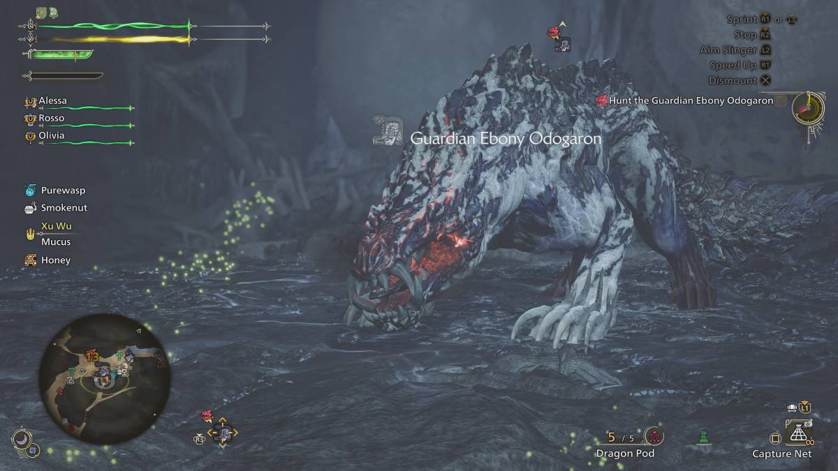 If you want to immediately encounter a Guardian Ebony Odogaron, head to Alma at the Quest Counter. Select the quest “Red Eyes in the Night.” It’ll immediately send you out to face one.