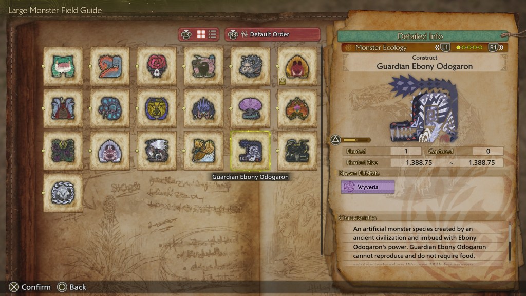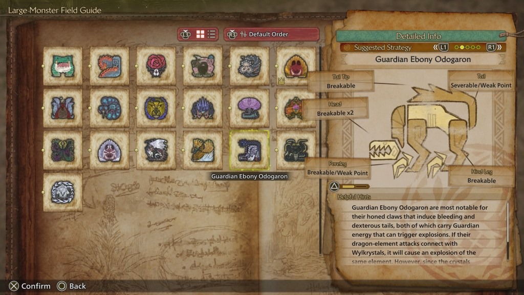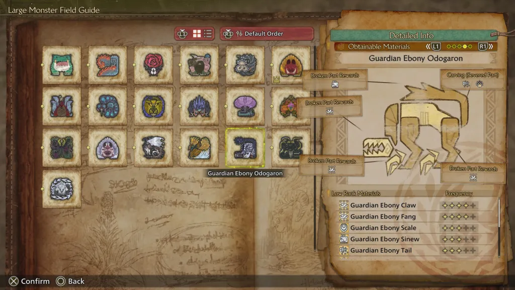 A lot of the Guardian Ebony Odogaron drops aren’t terribly difficult to get. Many of them drop as a result of breaking parts like the head, legs, and tail. The only one I ever really had issues with were the fangs, since it does move around quite quickly early in a fight and the Wylk explosions from the front may dissuade you from attacking at that angle. The Guardian Ebony Plate might give you some trouble, though. You’ll need that, alongside a tail, claw, and certificate, to make the G. Ebony Coil.