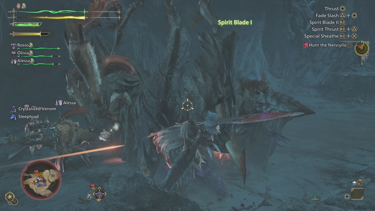 Unlike the Lala Barina, which jumps around a lot, the Nerscylla often swings instead. It will telegraph sending out silk, then use that attack to both zip around the area and swing into opponents. If you’re in its spider-web nest area in the Cliffs, which is where it will retreat to when it’s weakest, it will also disappear under the webbing and come up from below to strike.