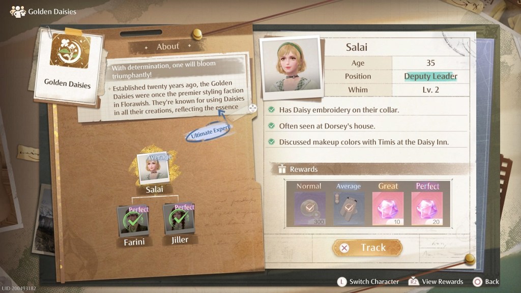 Before you can take on Salai in Infinity Nikki, you must beat the other two members of the Golden Daisies, Farini and Jiller. To find them, open the Pear-Pal tablet and click “Factions”. Head over to the “Golden Daisies” page, which will show you what members are available to take on. If you want to track someone’s location on the world map, highlight the person you want to challenge and press track. Farini and Jiller are relatively easy to beat, so you should be good to go if you have a few clothes in the recommended style.