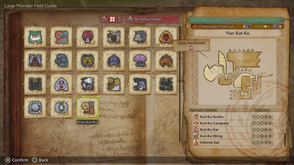 The funny thing is while the Yian Kut-Ku is easy to beat, it’s honestly difficult to get some of its parts. The highest frequency of appearances are for the Kut-Ku Carapace, Kut-Ku Ear, and Kut-Ku Scale+, and even those are only at three-stars. You do have a higher chance of getting the ear if you break its head. The Giant Beak, Kut-Ku Wing, Firecell Stone, and Inferno Sac are both pretty challenging to get. Also, as usual, you are guaranteed a Kut-Ku Certificate from the fight.