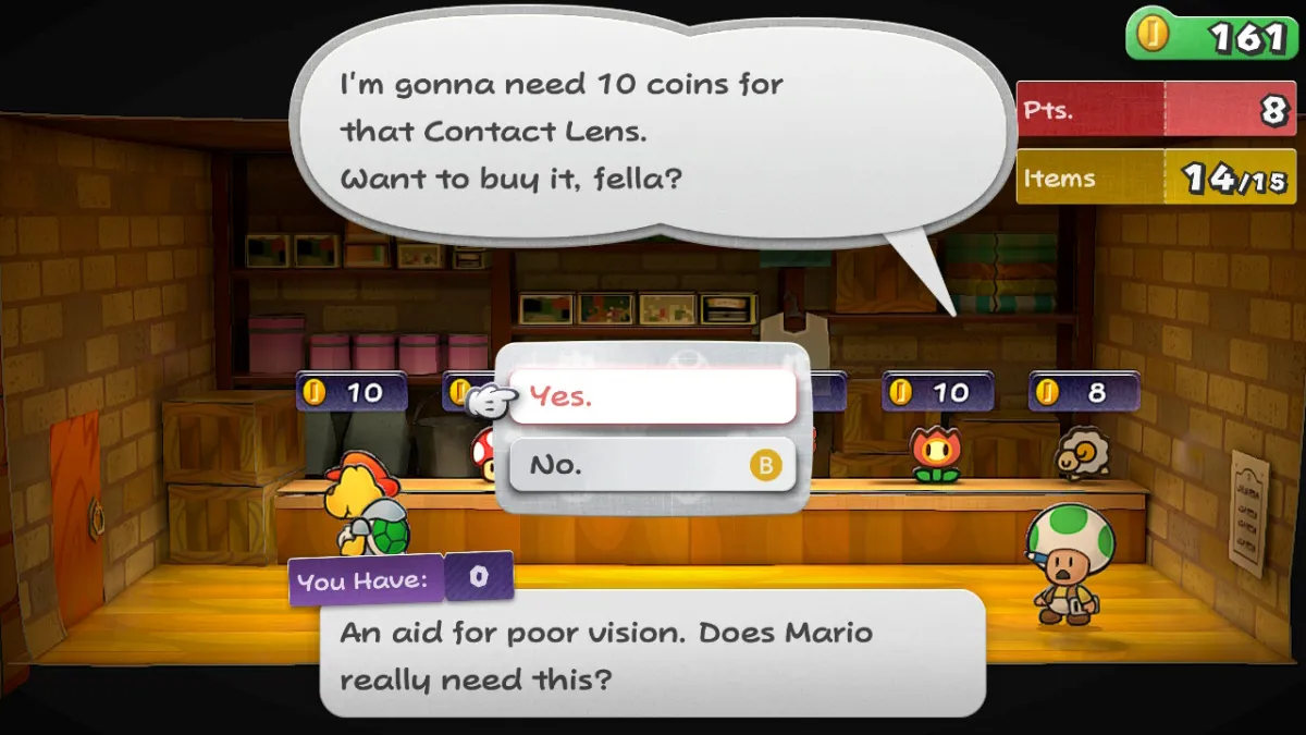 Not long after Mario gets to Rogueport in Paper Mario: The Thousand-Year Door, he can be responsible for crushing a poor Toad’s contact lens. Why? Because he dared to head toward the western side of the town. You can’t proceed through to Rogueport West until you get a new contact lens, but this is really just a clever way of keeping you from progressing past a certain point until you advance the story.