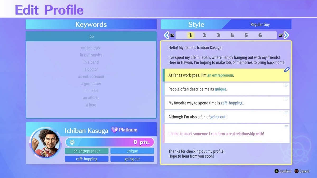 The goal of Miss Match in Like a Dragon: Infinite Wealth is to first find a match, get a perfect rating on your texting date, and then reap the rewards of meeting them in person. Starting with your profile, you can switch between six different versions: Regular Guy, Gentleman, High Energy, Intellectual, F*ckboy, and Life of the Party.
