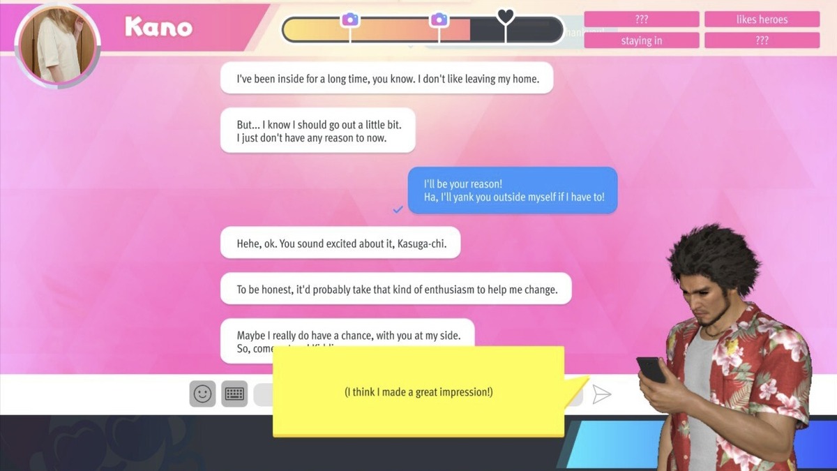 Once you match with someone, the key is to talk about the things they like. In addition, remember what you picked in your profile and pick the longest responses possible. This means a longer typing rhythm minigame in a short amount of time, but if you can do it fast enough, you’ll get the most points. The goal is to reach the max bar for the texting date in order to unlock the ability to meet with them in-person afterwards.