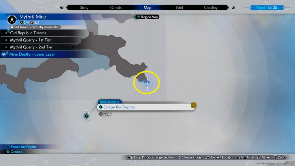 The trouble spot here is this location in the Mythril Mine Depths Middle Layer map that I circled below. That’s where the second climbing spot is. Because of the rock debris Barret blew away, you might not see the indicator on the ground. Also, because of the lighting in this location, you might not see the ledges. I highlighted them in the screenshot, so you can see them better.