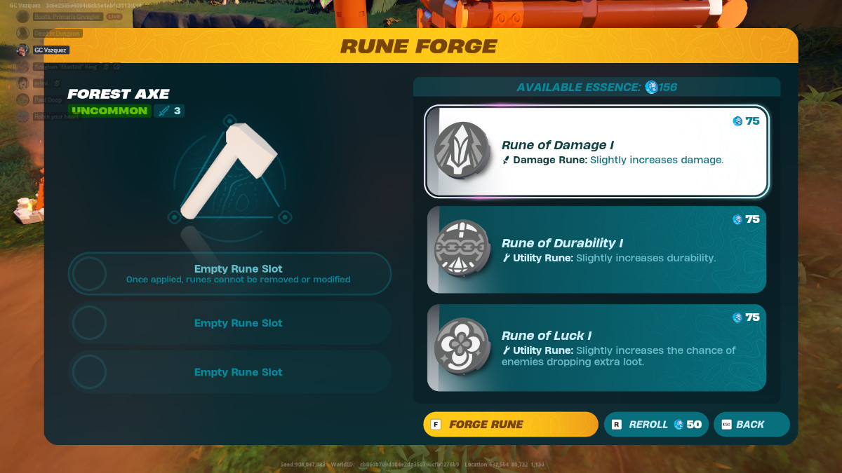 Click the roll button to randomly generate three runes from this list. You can then select a tool and apply one of those runes to it for a certain amount of essence. Once you’ve applied the rune to your tool, the other runes will disappear. If you don’t like the runes you rolled, you can reroll new runes at the cost of 50 essence. A tool can’t have more than one of the same kind of rune applied to it, so rerolling for the same runes isn’t beneficial. However, as long as you don’t apply the runes to a tool, you can always save your currently generated runes for a different tool later.