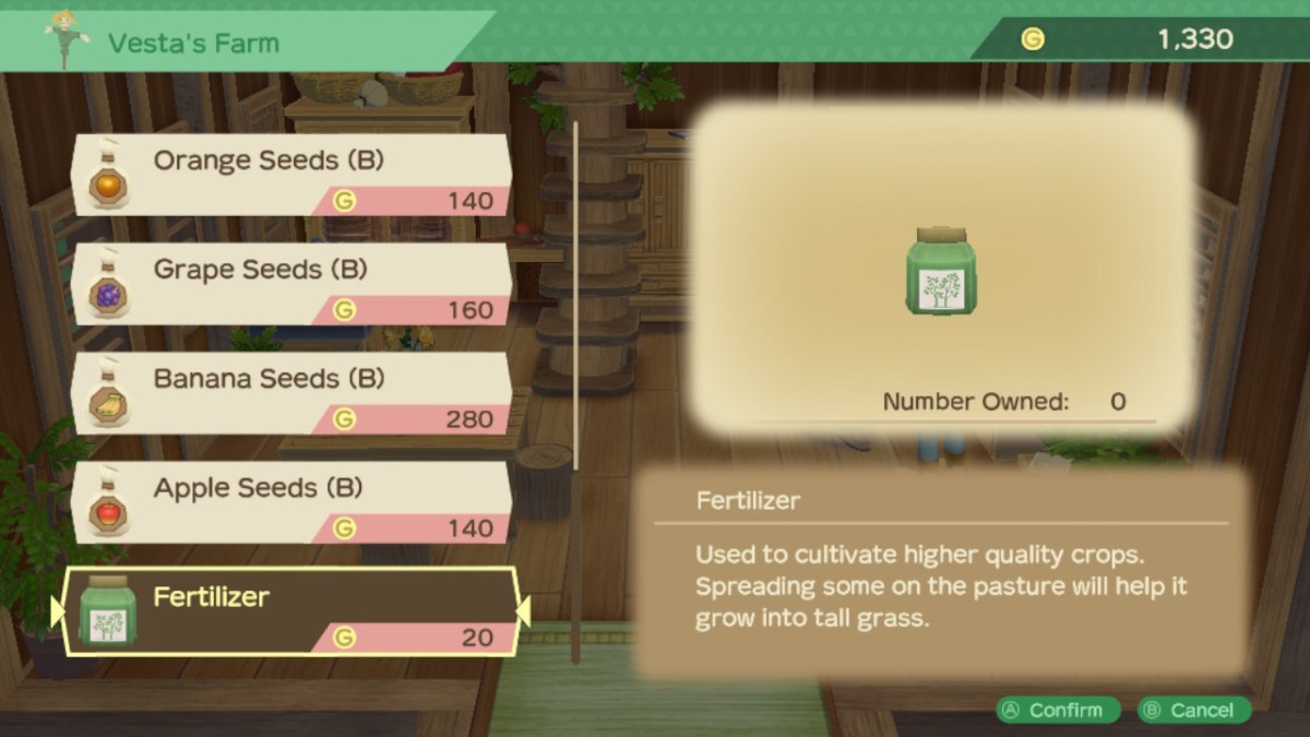 Basically, in either case you need to make some sort of initial investment. Story of Seasons: A Wonderful Life starts you out with 30 fodder to feed your cow. But from there, you need to get your own. At Vesta’s farm, you can buy fertilizer. A bag costs you 20G. Using it on a square in the pasture behind the barn on your farm causes grass to start growing. I recommend getting about 10-15 bags initially. Get a whole patch started. If it isn’t raining, leave your cow out there all day. The pasture keeps them happy and fed. That sweet spot of 10-15 means you should always have enough fully-grown patches of grass available so if bad weather does come up, you can take your sickle, cut one or two bunches, and have fodder for your cow. If you decide to just buy fodder, go to the ledger next the shipping box at your farm. Buy it, and it’ll be added to your stores the next day. Fodder is 20G, while Fodder+ is 50G.