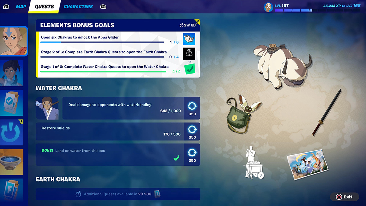 All you have to do is complete four of those tasks, and the Water Chakra will become open. Now you just have to wait until Epic Games adds the remaining five Chakras to the game. Once they go live, complete all six of them to get Appa in Fortnite for free.