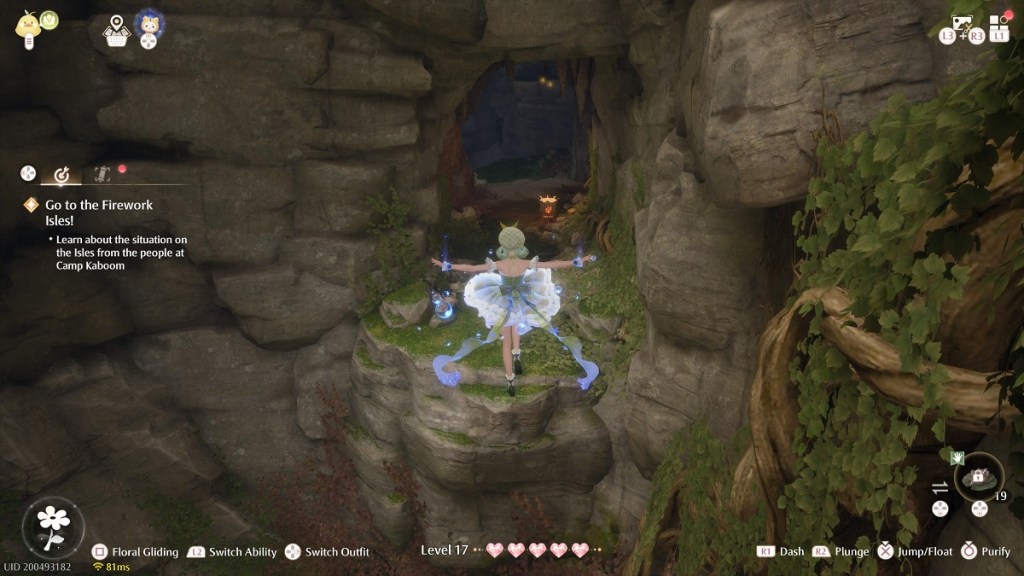 Enter the cave and continue to walk forward until you see a dead end. Drop down the cliff edge and defeat the opponents in front of you. Head to the right, and you should see a rocky ledge you can jump onto. There will be corresponding platforms in front of you that you will want to travel along. We recommend using the Floral Gliding ability, as it will make a lot of these jumps easier. You can do these jumps without unlocking the ability, but it may take a few tries, as some jumps can be a bit finicky.