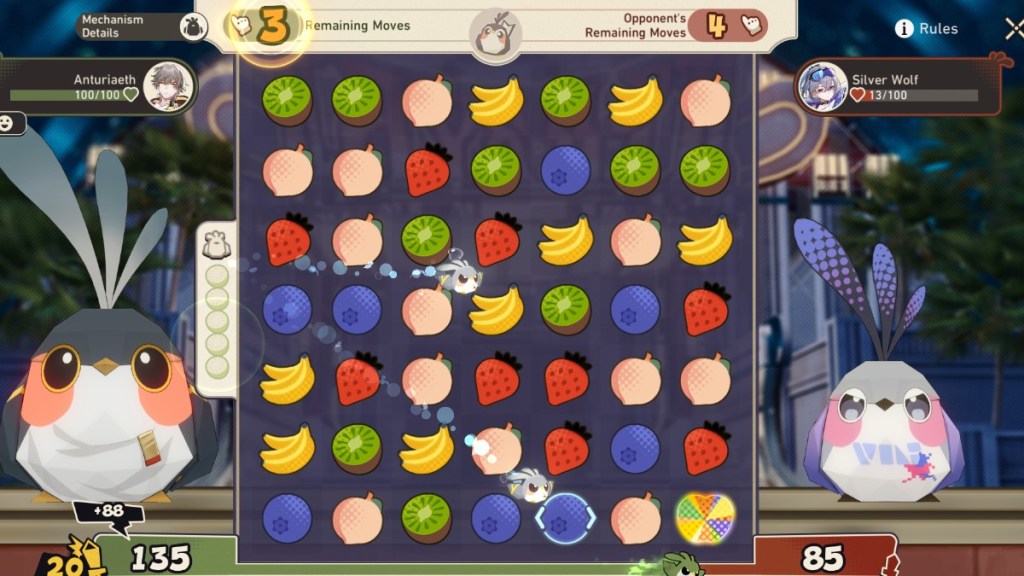 Both players start with 100 HP. Health will be deducted at the end of each round when the Origami Birds fight. The losing player will have HP reduced, and the amount is determined by the difference between both players’ points in the previous round. Matching four or more icons will create a bomb which takes out surrounding icons and giving you more points. If you switch a rainbow apple icon, it will take out a random selection of icons with it. You’ll also occasionally be assigned goals where if you take out a certain amount of a particular fruit (such as kiwis), a bomb will be formed. It takes out more fruit. This is how you can generate massive amounts of points.