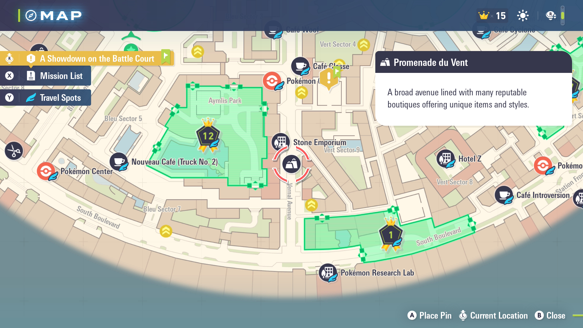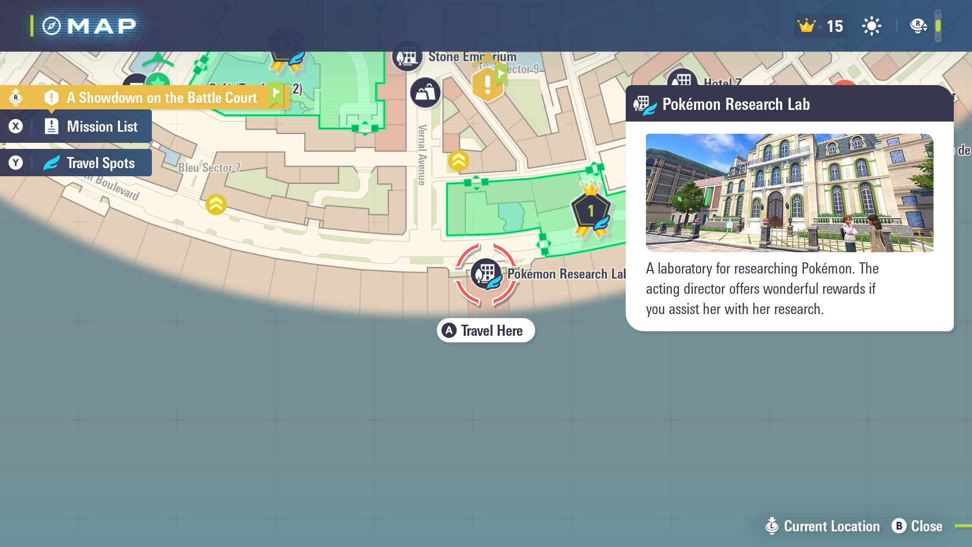 Your first chance to get one of these three is when the Side Mission “A Call from Mable” appears. This tasks you with checking in with the professor at the Pokemon Research Lab right near Wild Zone 1 and Vernal Avenue. It comes up right after you reach Rank V in the ZA Royale. Here it is on the map, in case you can’t remember where she works.