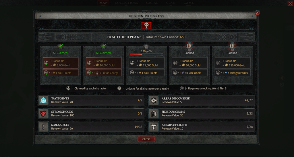 Increasing Renown is done through an array of activities. This can be through activating Waypoints, which is Diablo‘s version of fast travel, discovering areas (or just exploring the map), finding Altars of Lilith, completing Side Dungeons, finishing Side Quests, and taking on Strongholds. Thankfully, before you throw yourself at Strongholds, you can easily up your Renown by simply walking around and exploring. But if you want to bolster the amount of Renown you get quickly, it is also advised that you pick up any Side Quests you see in any of the towns and cities you will come across.