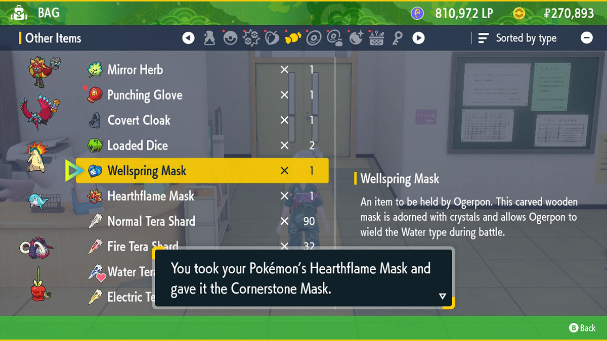Ogerpon has four forms it can transform into in Pokemon Scarlet and Violet, with each mask changing its element type. Unlike past Legendaries, though, Ogerpon’s transformation isn’t tied to Key Items, as its masks are actually considered Held Items instead. Transforming Ogerpon requires you to make the Kitakami Legendary hold either the Wellspring Mask, Hearthflame Mask, or Cornerstone Mask. To use this feature, access your bag by pressing the X button on your Nintendo Switch controller. Next, look for Ogerpon’s masks in the Other Items tab and then select which one you want to give to it. After making Ogerpon hold a mask, it will automatically transform to its new typing. If you want Ogerpon to revert back to its Teal Mask form, just put away the mask it’s currently holding.