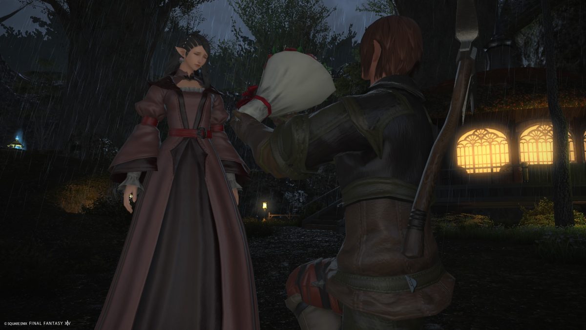 In fact, there is only one event quest in the first place. Completion of “I Promise You a Rose Garden” will grant you the new Bouquet emote as a reward. You will then be able to kneel down on one knee anytime you like and present a bouquet of roses. Feel free to use this in the future for proposals, dates, and the like.