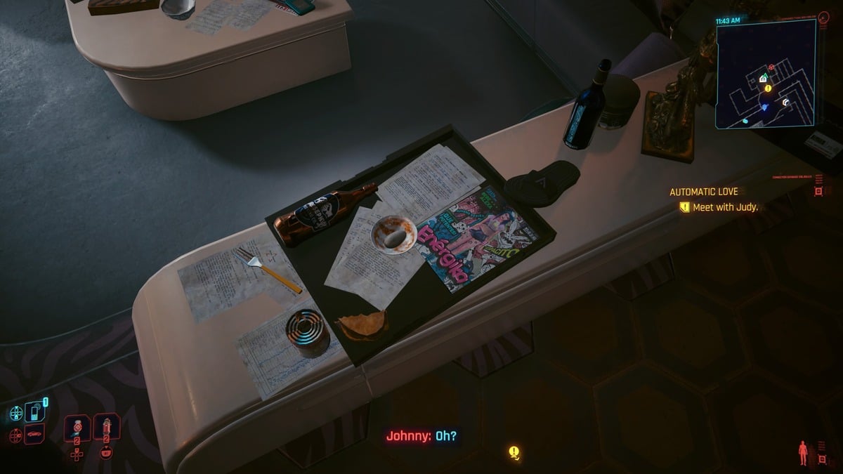 After acquiring the iguana egg, you’ll want to complete the Act 1 quest “The Heist.” Once it’s done, continue in the main story in Act 2 until you go to Tom’s Diner and speak with Takemura there. At this point, you can finally return to V’s apartment and find a bowl there. Interact with this bowl to place the iguana egg inside of it.