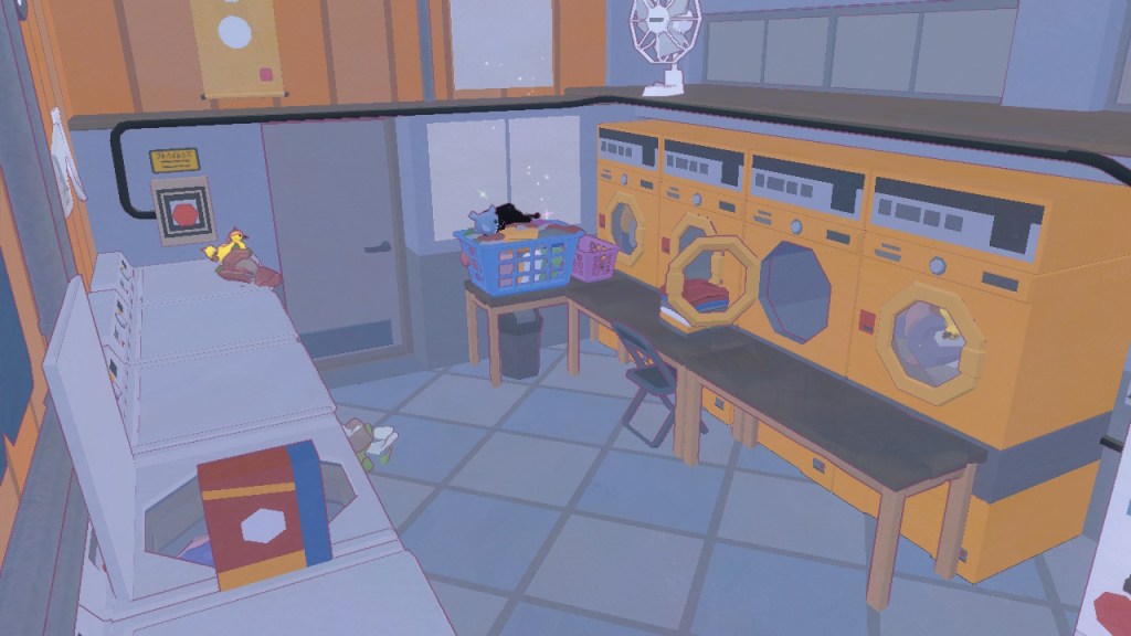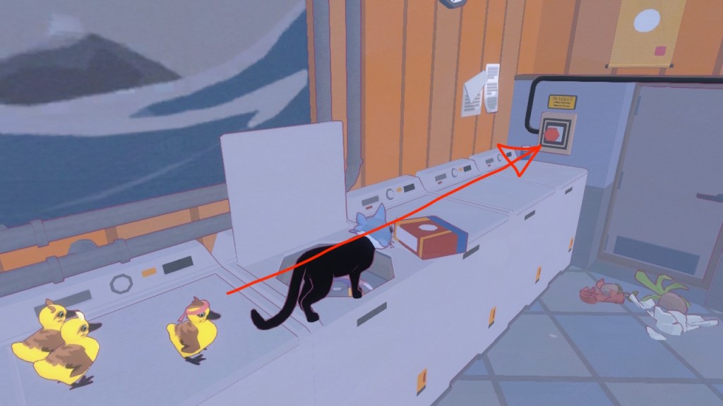 Hop in front of the dryer and talk to the duckling inside of it in Little Kitty, Big City once you’re in the laundromat. It won’t leave until the ride ends. The power cord shows it connects to a red button on the other side of the laundromat.
