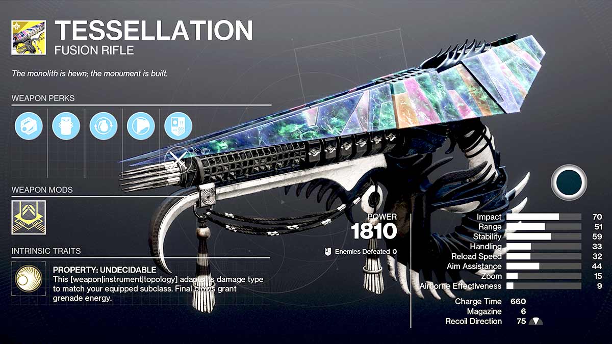 - Intrinsic Trait: PROPERTY UNDECIDABLE (This weapon adapts its damage type to match your equipped subclass. Final blows grand grenade energy).