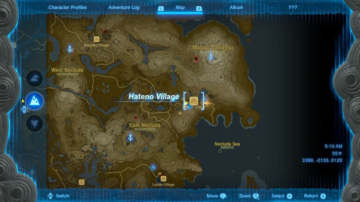 Hateno Village is located in the Necluda region at map coordinates 3359, -2149, 0118. The easiest way that I’ve found of getting there is by going to the Mount Lanayru Skyview Tower first. Once there, launch into the sky and glide southwest. You’ll see Zanmik Shrine in the distance. Hateno Village is just to the right of it. Don’t forget to break the green seal at Zanmik Shrine so you can fast travel back to the village at any time. Alternatively, if you don’t have the Mount Lanayru Skyview Tower unlocked, you can also glide northeast from the Rabella Wetlands Skyview Tower. It takes a bit longer to reach Hateno Village from here, but it may be easier depending on which towers you’ve visited previously.