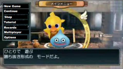 When the game first starts, a menu pops up with a chocobo and slime. The menu roughly translates to this: New Game, Continue, Shop, Tutorial, Records, Multiplayer and Options. So the first thing you'll want to do is make a new game. There are eight different player profile options then available. Go head and save in one. The game then asks for a five character name. The entry options are hirigana, katakana and the alphabet.