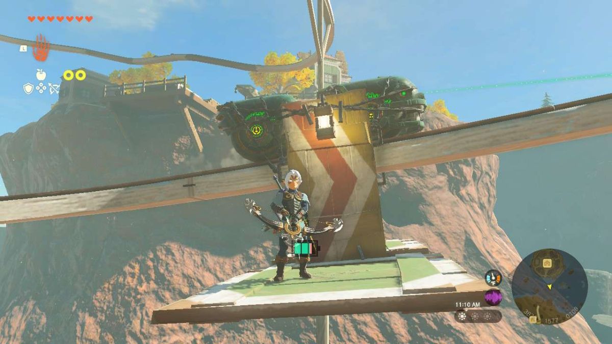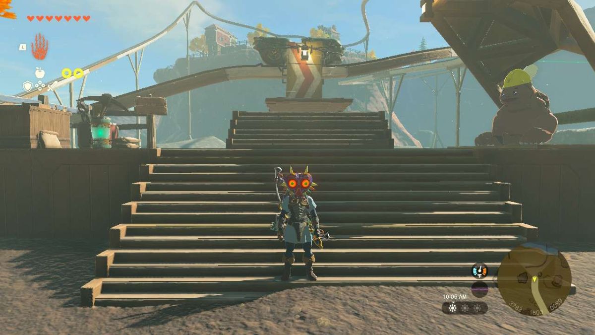 Tarrey Town is located in the Akkala Highlands region, southeast of the Ulri Mountain Skyview Tower, at map coordinates 3967, 1610, 0127. To access the town, travel to the Hudson Construction Site in the Torin Wetland, just south of the Ulri Mountain Skyview Tower. Here, you’ll see a large rail with a moveable railcar in the east. If the railcar isn’t here, speak to Greyson the Goron to the right of the access point. Greyson will summon it to the platform. Hop onto the wooden railcar and strike the Zonai Device at the top with Link’s weapon to activate it and make it move. The railcar will slowly take Link up to Tarrey Town. It won’t stop at the entrance, though, so make sure you either hit the Zonai Device once more to stop it once you get there or quickly jump off.