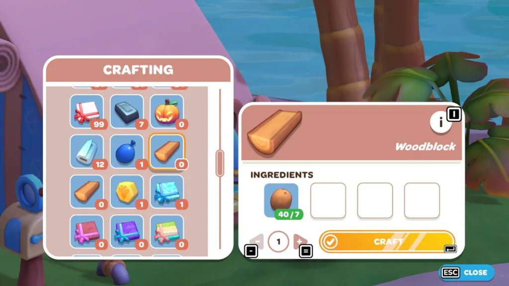 The easiest way to get Woodblocks is by crafting them! Unlike cooking recipes, you can’t tinker your way into discovering crafting plans. Fortunately, there are two different Woodblock crafting plans you can find, and they’re both relatively easy to obtain. One set of crafting plans can be earned by reaching Friendship Level Four with Keroppi. He’ll give you the crafting plans for making Woodblocks out of sticks as a reward. This crafting recipe requires five Sticks for every Woodblock. There’s an abundance of Sticks to find in Hello Kitty Island Adventure, and they’ll most likely be your main source of crafting Woodblocks.