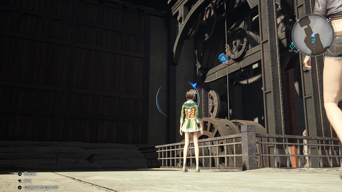While standing in front of the giant metal wheel, aim your camera up and look for the “Triangle” button. Use Yuffie’s throwing star to cut down the wooden pole. Like the previous sections, tap “L2” to have her attach her rope to the wooden beam. Now, this is another part that can be a bit tricky.