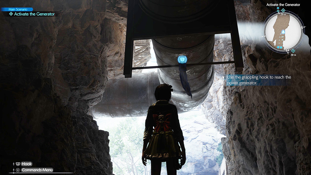 This part can be a bit confusing at first. But once you attach to the metal wheel with your rope, you must hold your joystick to the right to keep swinging Yuffie towards the cave wall. By doing this, you will slowly crank the wheel counterclockwise. Eventually, Yuffie will be lined up so she can hop off on the concrete platform behind it. Press the “Circle” button to land on the ground.