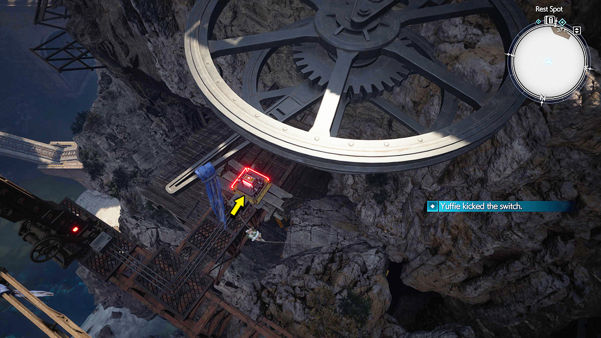 Once Yuffie starts getting close to the green button, you will want to use your left joystick to swing her directly into the switch. If done correctly, Yuffie will kick the green switch to turn it red. You should also get a message saying, “Yuffie has kicked the switch.”