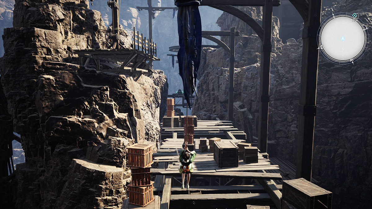 Once the wooded beam has been lifted up, Yuffie will jump to the next platform with L2. Hang on, as the beam starts moving, eventually taking her around a corner. The beam will continue moving forward on a conveyor belt. Swing Yuffie back and forth to smash any boxes you see to collect materials. Eventually, the conveyor belt will come to a stop.