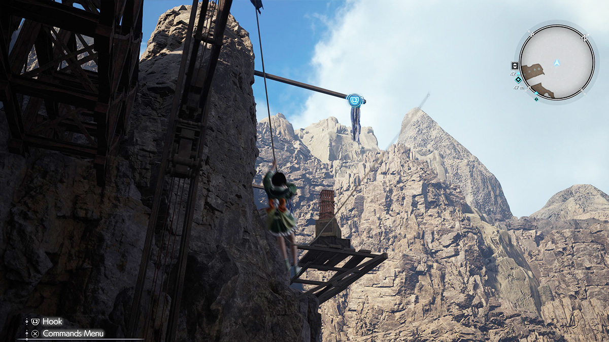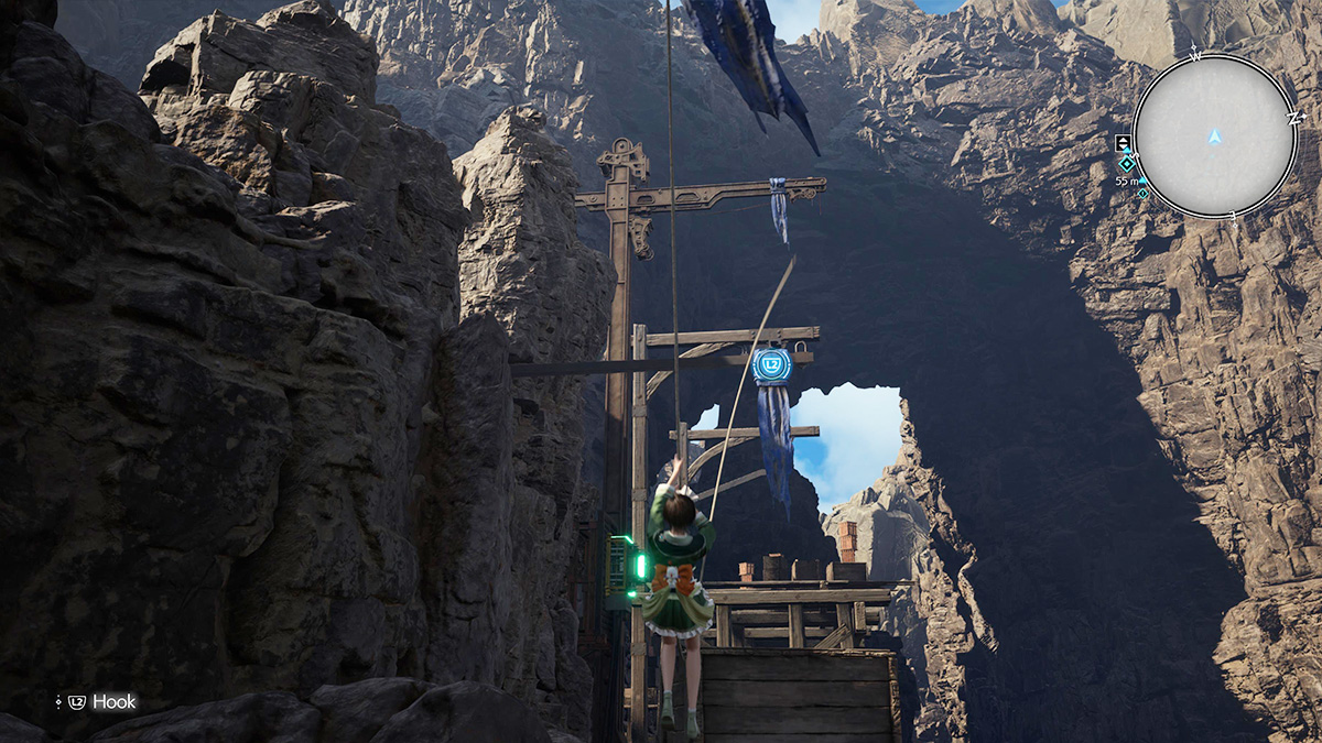 While you are swinging in the air on the rope, you have to actually use your left joystick to turn Yuffie around. Using the rope’s swinging momentum, turn the Wutai fighter around. The reason for this is that there is a hidden wall behind you that you need to jump to. Once you are facing the right direction, keep swinging on the grappling hook and then press the “Circle” button to have Yuffie jump to the climbing wall.