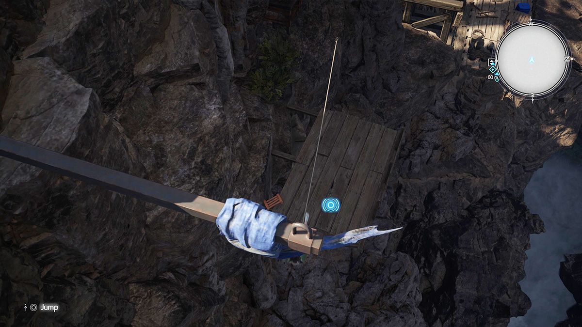 This part is a bit tricky. Once you land on the small island platform, you want to turn around and face the direction you just came from. Tilty your camera up and look for the “Triangle” symbol. You need to use Yuffie’s throwing star to cut the rope to create a new wood beam for her to grab onto. After you knock down the wooden bar, press “L2” to hook on to it.
