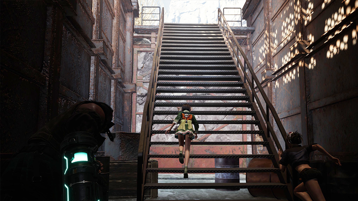 From the elevator control panel, turn around and take the winding path inside the dilapated building. Eventually, you will find a set of stairs leading you to the next level. After climbing the metal steps, keep traveling forward until you see the wooden ramp to your left. To reach the next part, walk up the makeshift ramp.