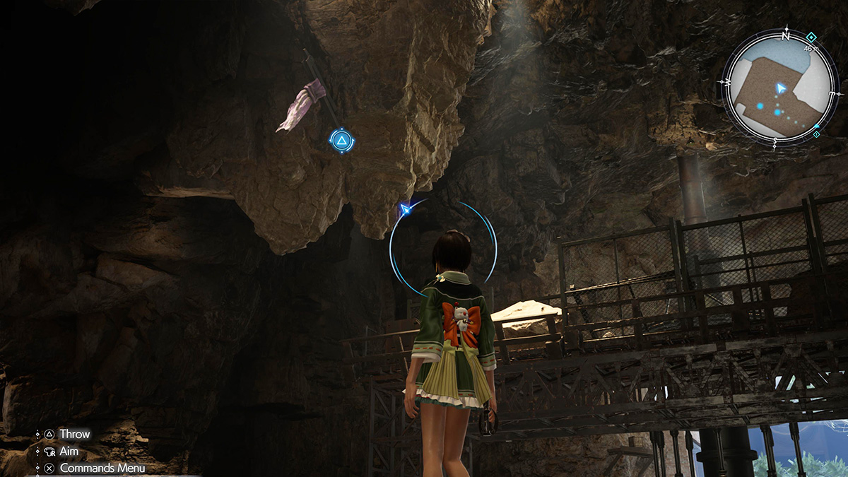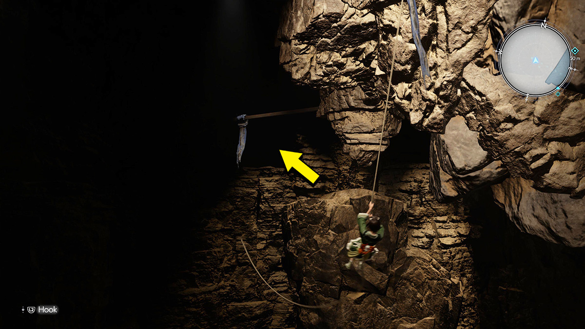 Now that you are on the second floor, head left to the large cave opening. Pan your camera up and look for the “L2” symbol. Use your grappling hook to swing Yuffie in the air and drop on the small platform in the middle of the open-area section.