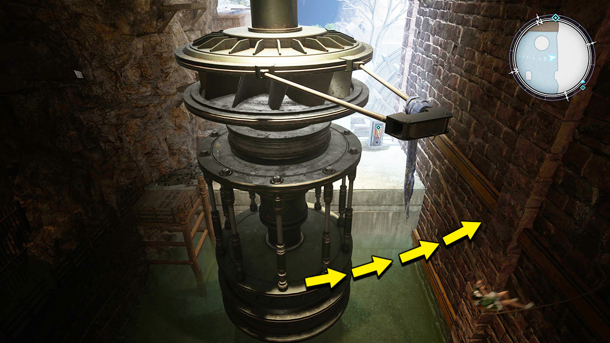 Once you’ve reached the bottom, you will discover two new yellow conveyor poles. Ignore them for now and hook a left around the corner until you reach another “water” area. This time, there will be a giant metal wheel in the middle that we will have to maneuver around.