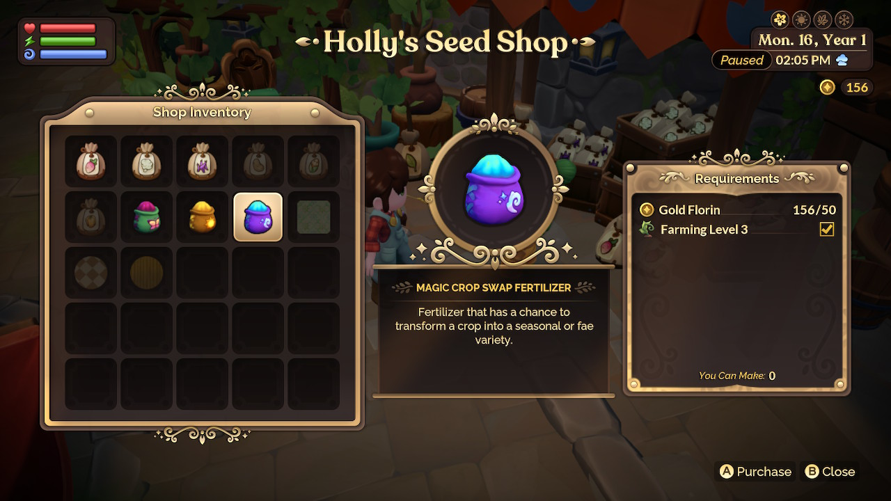 First, open your map on PC or press the minus button on your Nintendo Switch. Then, navigate to the town center. Once you’re there, have a chat with Holly. She is stationed on the right side and has forest green hair. Speak with her and select the option to open her shop. You’ll notice she’s selling a special item called the Magic Crop Swap Fertilizer. This item is what you’ll need to use to transform your regular crops into seasonal crops. Make sure you have at least 50 Gold Florin to purchase it. You also need to be at least Farming Level 3 before you’re able to buy it.