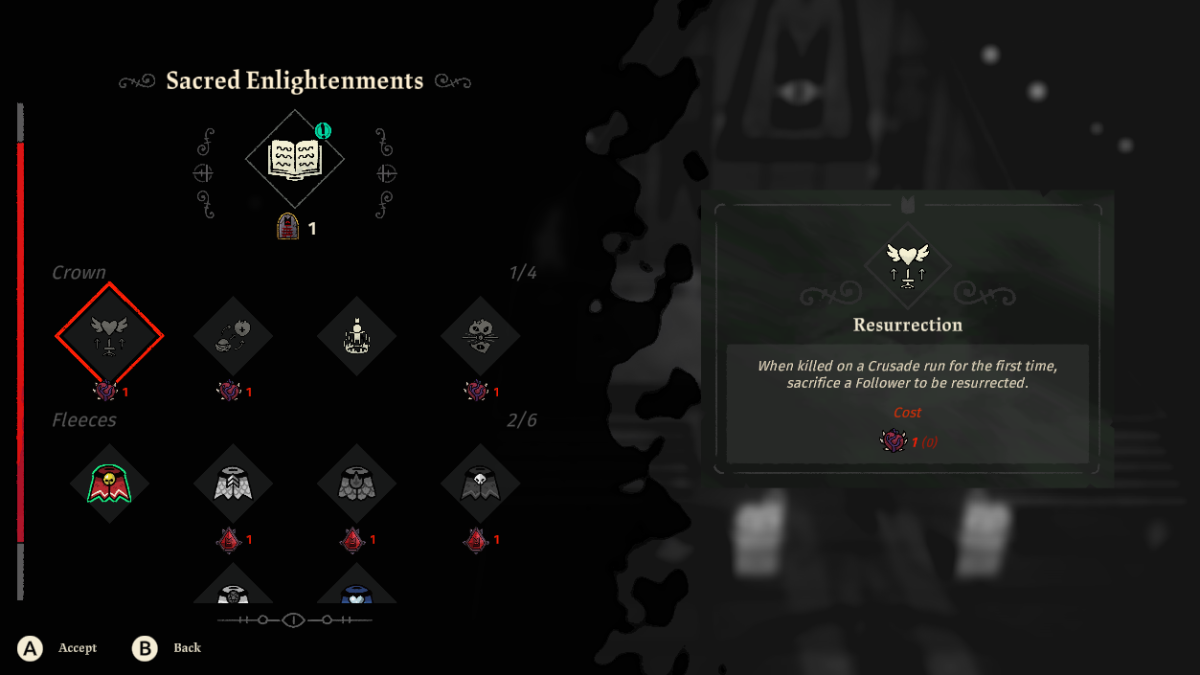- Obtaining Resurrection through your Crown: This is a revive that comes at the cost of sacrificing one of your followers. It is reliant on upgrading your Crown by performing Sermons to obtain Commandment Piece. You can also get Ritual of the Dead as a Doctrine to more or less cancel this out.
