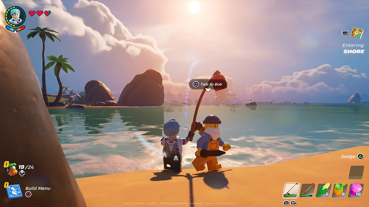 Fishing is pretty easy and simple once you have a Lego Fortnite fishing rod. What you want to do is find a large body of water, such as a river, lake, or ocean. Get close to the edge of the water, pull out the fishing rod, and then hold down the right trigger (for controller players) to cast the rod into the water. Wait until you get a tug on the line, and then hold down the right trigger again to reel it and claim your prize.