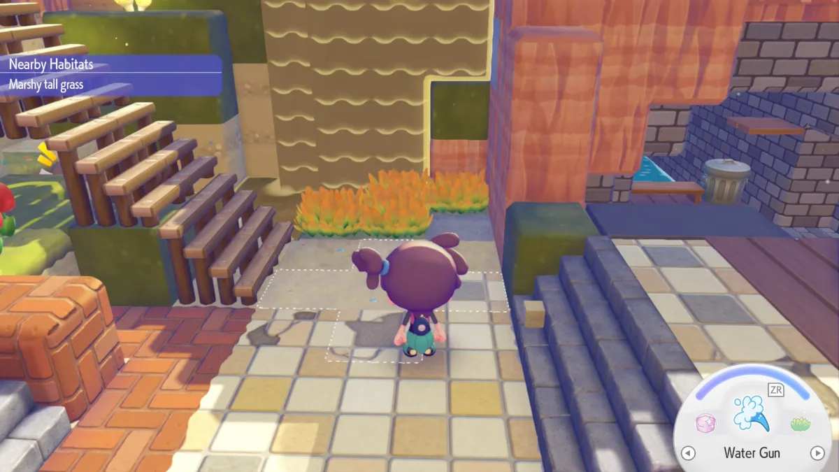 The third part is when you start to get to the ability to make water tile sources and place a waterfall in Pokemon Pokopia. After seeing the waterwheel, Piplup’s next request will be a waterfall near the Area Gate entrance where there’s a small pond. However, you can’t do this immediately. First, you need to get a Paldean Wooper to move the area to learn how. On the other side of the pond is some marsh water. You’ll need to place four tufts of tall grass there. Doing so makes the Wooper variant you need to spawn almost immediately.