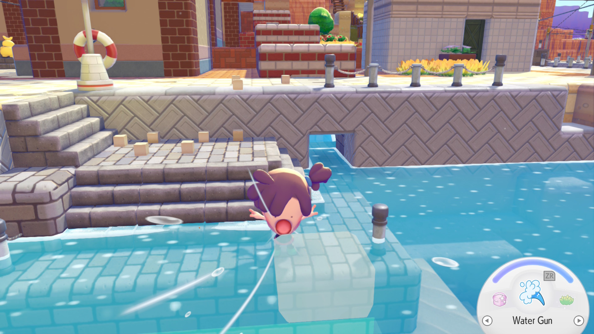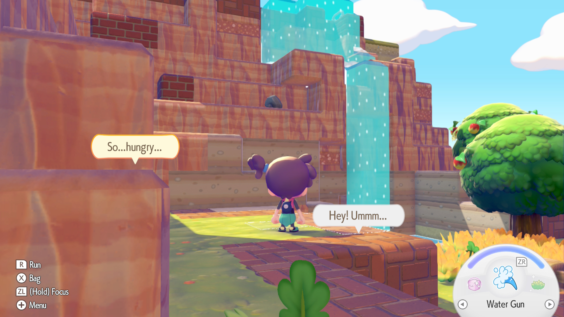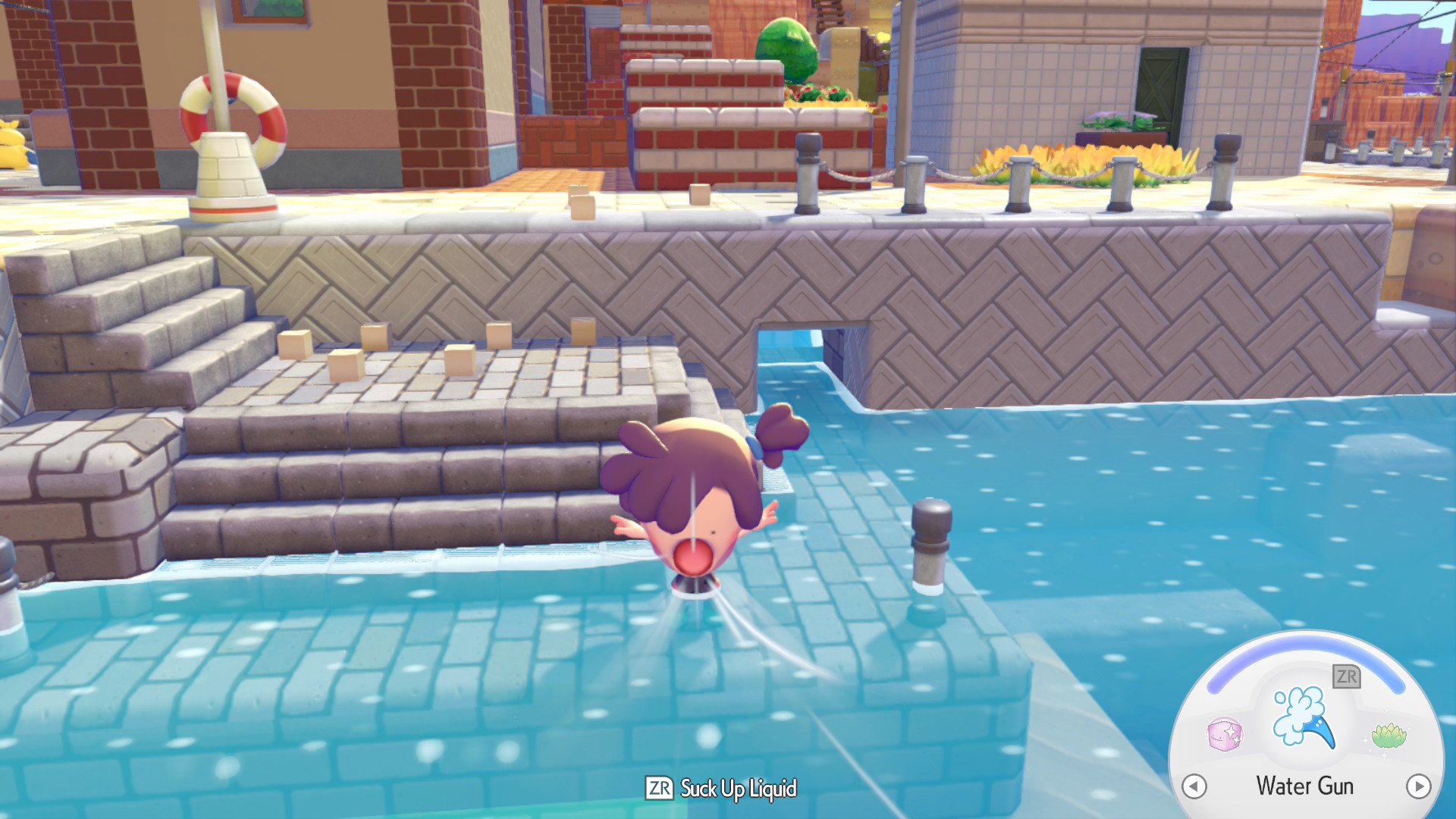 Wooper then teaches you the trick. When inhaling with Y and near or in water, press ZR. You’ll then suck up the liquid. Walk and jump to where you want to place that water, and you’ll be able to make ponds, rivers, and lakes. For a waterfall, head to heights above the area, then press A to let the water out.