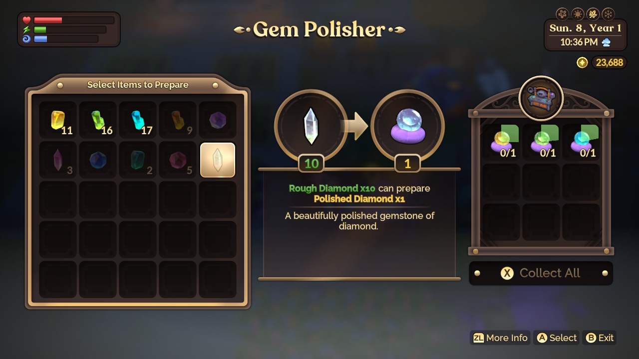 Okay, so I’m not going to waste your time with a lot of comparisons. There are none to be had. The best thing to do is dive as deep into one of the dungeons as you can, then get enough rough and raw versions of gems to create polished ones in the Gem Polisher. 10 of one type put into there nets you one polished version. In Saltwater Mines, the most profitable gem is Topaz. In Floating Ruins, it is Emerald. In Scorched Caverns, I’ve found it is Diamond. But also, it isn’t a bad idea to go with cheaper gems! Once your mining level and pickaxe are high and strong enough, you can get tons of rough versions of gems from a single source. So yes, Citrine is the cheapest one in Saltwater Mines. However, when you’re getting over 100 after a few floors, it adds up! Especially since the Saltwater Mines has the bonus of not requiring any sort of potion like Floating Ruins or Scorched Caverns to get in your way. So yeah, polished gems are the way to go for quick Fae Farm money and easy profits. Here’s a list of the ones that are my favorite to sell.