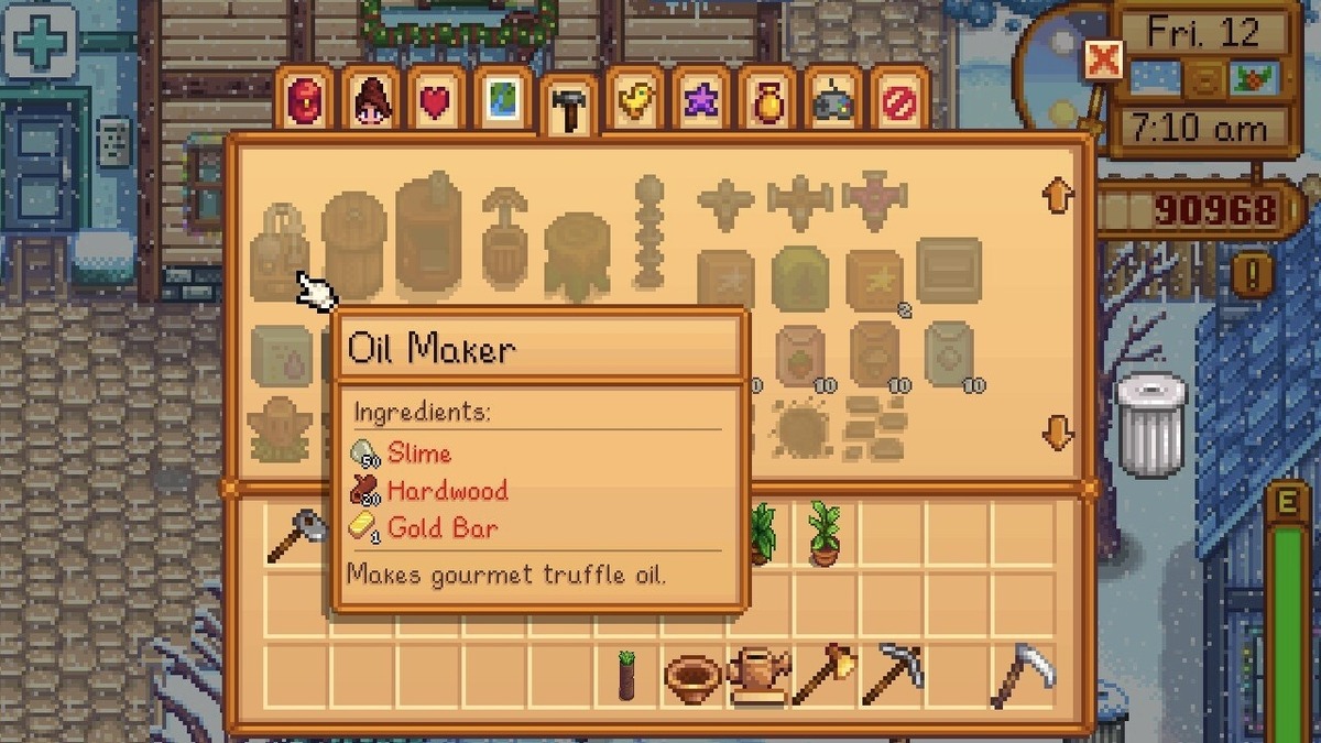 With this, you can then put in some corn or sunflowers and make some delicious oil for your cooking. In addition, this Oil Maker also makes Truffle Oil. That requires a single truffle to make and it takes about six hours of in-game time.