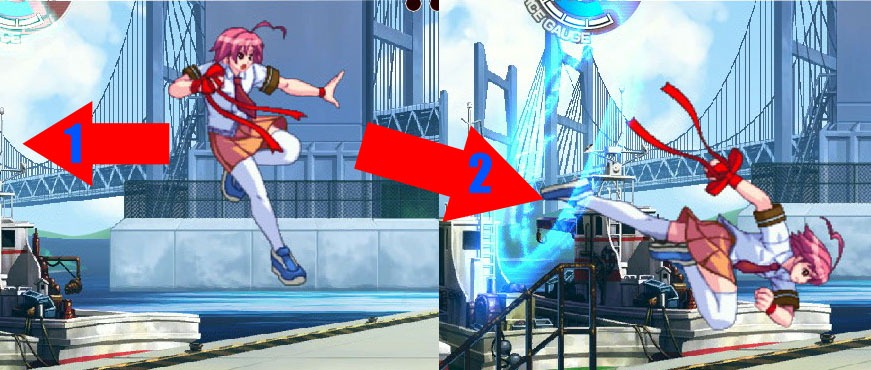 Homing (General Rules) – Whenever you press the D button with or without a directional input, after a brief startup(1), your character will perform her Homing Dash toward your opponent(2). During the initial start-up time, which varies depending on which direction (or lack thereof) Homing you are performing; you cannot do anything at all, leaving you somewhat vulnerable. Once you begin actually flying toward your opponent, you can influence the flight path by inputting additional directional inputs(3) or increasing your speed by pressing D again(4). At this point, you can also cancel your Homing Dash into an attack or block incoming attacks from your opponent(5). If you touch the ground at any time during a Homing Dash, it will cancel it completely, leaving you in a neutral state.