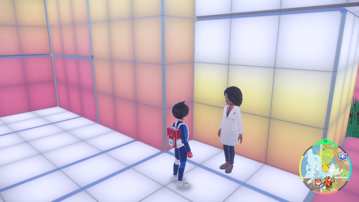 Of course, you need first to unlock the Synchro Machine before you can use it to play as a Pokemon. Thankfully, you can unlock this feature very early in The Indigo Disk DLC. All you need to do is unlock the Terarium and step into it. As soon as you get there, you can head to the Central Plaza and speak with the professor in the above screenshot.
