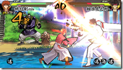 The basic controls for Rurouni Kenshin: Saisen are simple enough to pick up. Back to guard, down to crouch, square for weak attacks, triangle for a medium attack, and circle for a strong attack. X is for jump, but that isn’t the only kind of jump in the PSP fighter.