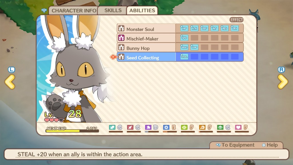 The Scrabbit is especially helpful in a situation when you have a full team of Thieves and Scrabbits for plundering from stages. This is because it has the Ability Seed Collecting. This boosts its already admirable Steal stat by 20 more points if an ally is in its action area. It’s a really common occurrence!