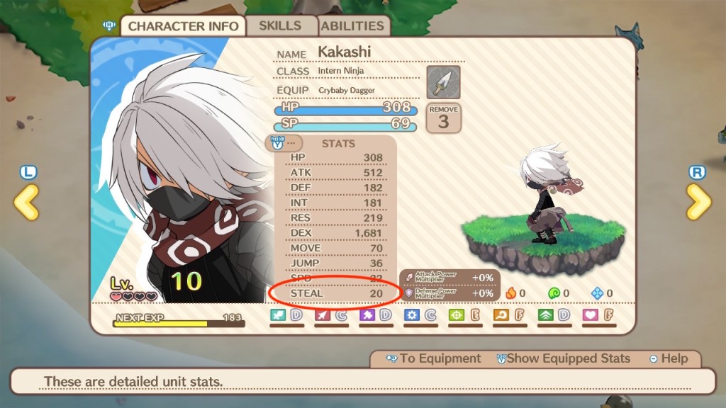 When you create a character, this is very easy to see on the creation page. As shown in the Ninja screenshot I shared below, it is flat-out labeled as Steal. Now, a Ninja isn’t ideal. Its level will be 20. Instead, you should rely on a team of Thieves and Scrabbits. Both of them have a base Steal stat of 40, which is one of the highest in the game. Fortunately, you can make both pretty much right away.