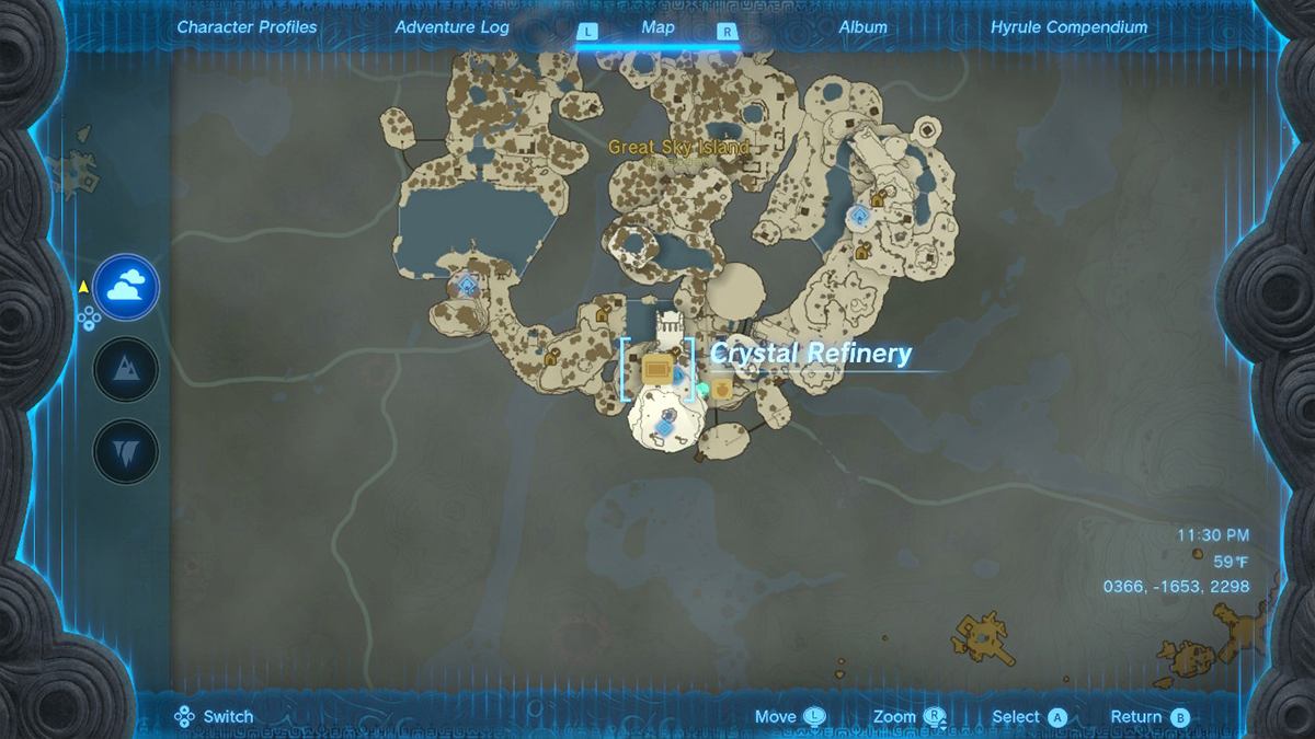 After processing your Zonaite into a Crystallized Charge at the Forge Construct, you can then trade 100 of them for an Energy Well at the Crystal Refinery. This is essentially a second battery charge upgrade for Link, which means you can ride your makeshift monster trucks across Hyrule Field. You can access the first refinery on Great Sky Island just outside of the Room of Awakening. The Construct can be directly warped to using the Nachoyah Shrine fast travel point. But if you don’t feel like going all the way back to the tutorial area, you are in luck! There is a second Crystal Refinery in Hyrule, just outside the north Lookout Landing exit. The exact location for both refiners is shown in the following screenshots: