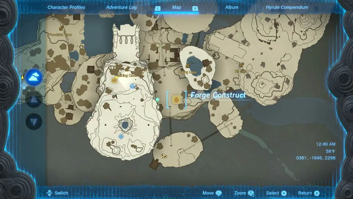 Although Zonaite was introduced during the tutorial on Great Sky Island, it’s easy to miss what it is used for. I know I forgot about the chunks of rock after rushing to dive down to Hyrule. The precious metal is actually really important, though, as it can be traded for some pivotal upgrades. To process Zonaite, you must return to the Forge Construct on the Great Sky Island. The quickest way to get there is to warp to the Nachoyah Shrine fast travel point on the south island next to Mining Cave. After entering the cave, you can trade two Zonaite for a Zonai Charge or three Zonaite for a Crystallized Charge by interacting with the tables next to the friendly Construct. The exact location is on the map I’ve provided below:
