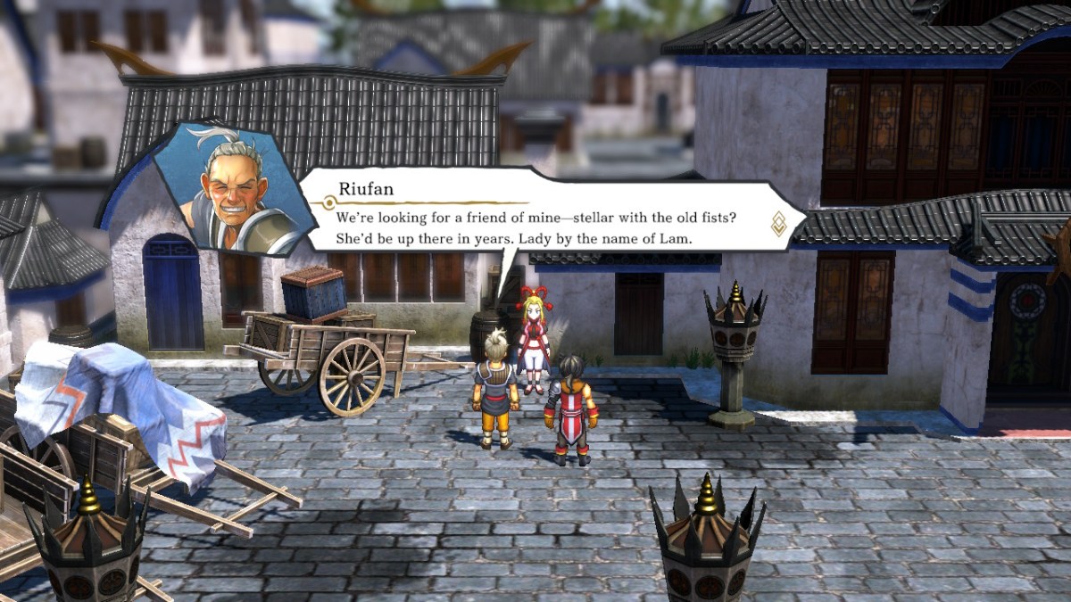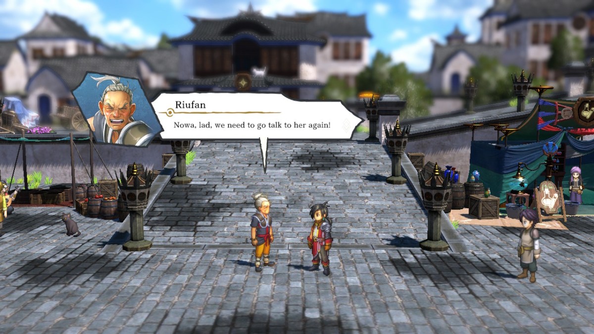 When you walk into town, Riufan will comment on the situation. Head to the northwest corner of town, between the rune shop and B’Baba’s house. When you speak to the blonde woman with the ???s in place of a name this time, she’ll actually talk with Riufan. However, the conversation won’t go anywhere.