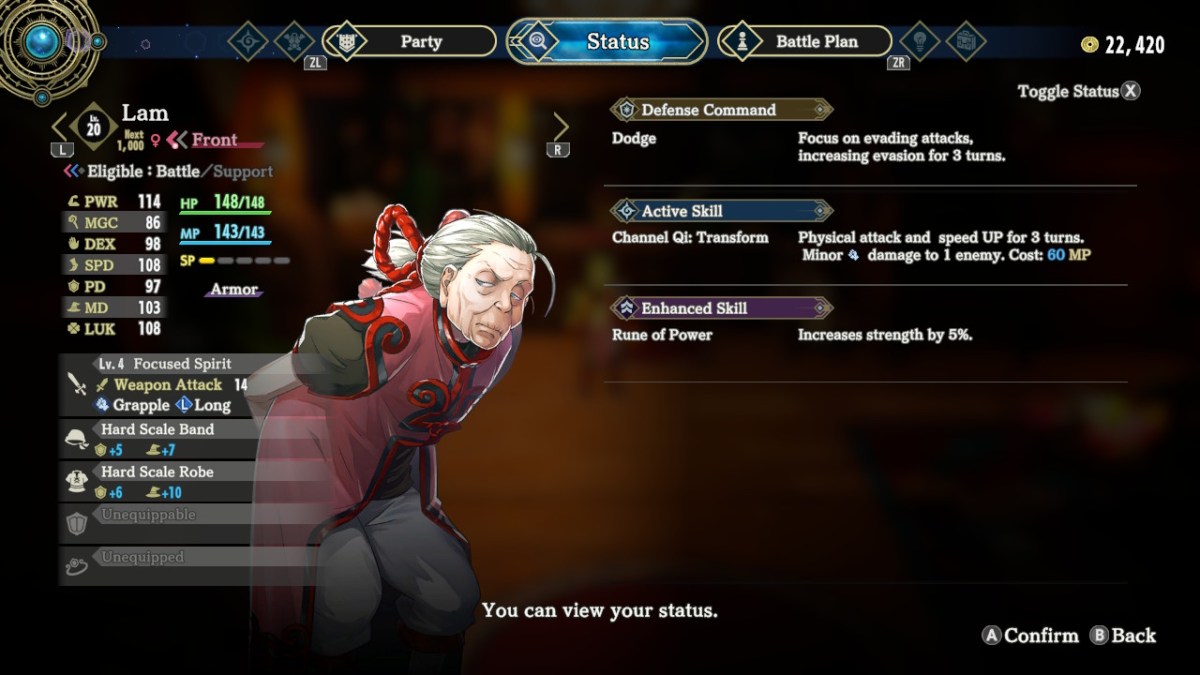 I think Lam is a lot more useful than Riufan, actually. She joins at level 20. She is a long-range unit, which means you can keep her in the back row. She has a Rune of Power already equipped. Also, she has a neat Channel Qi: Transform kill that offers a temporary damage and speed buff while also hitting one enemy. I think she’s fun!